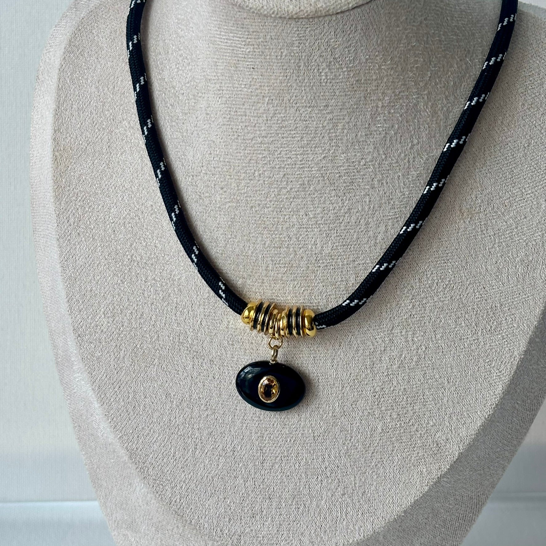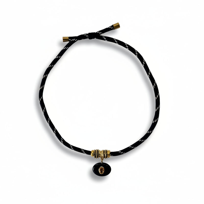 Bold yet effortless, this necklace features a black onyx pendant accented with a citrine stone, finished with gold accent beads on our signature adjustable rope cord. The contrast between deep black onyx and warm citrine creates a striking, grounded look that feels modern and timeless.
