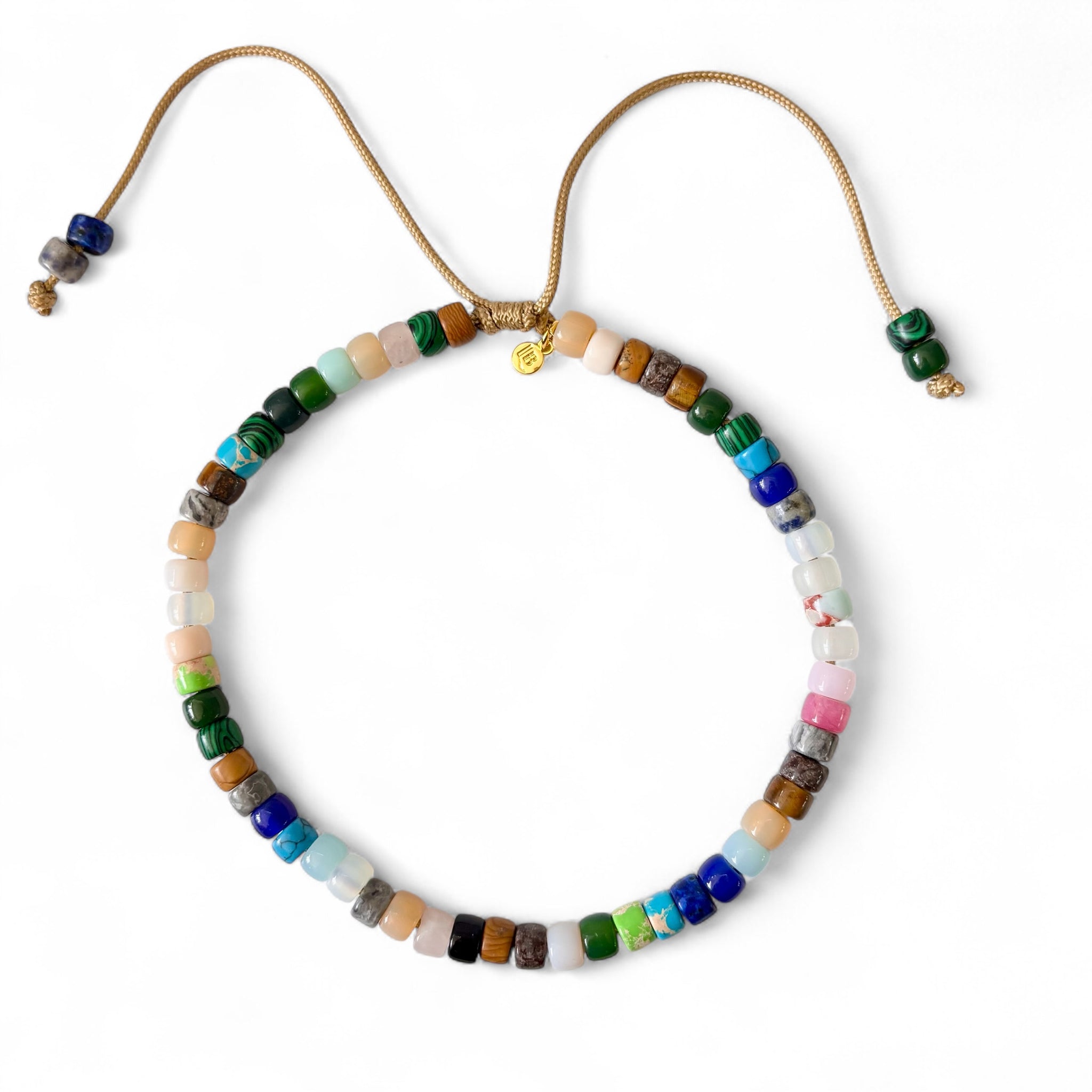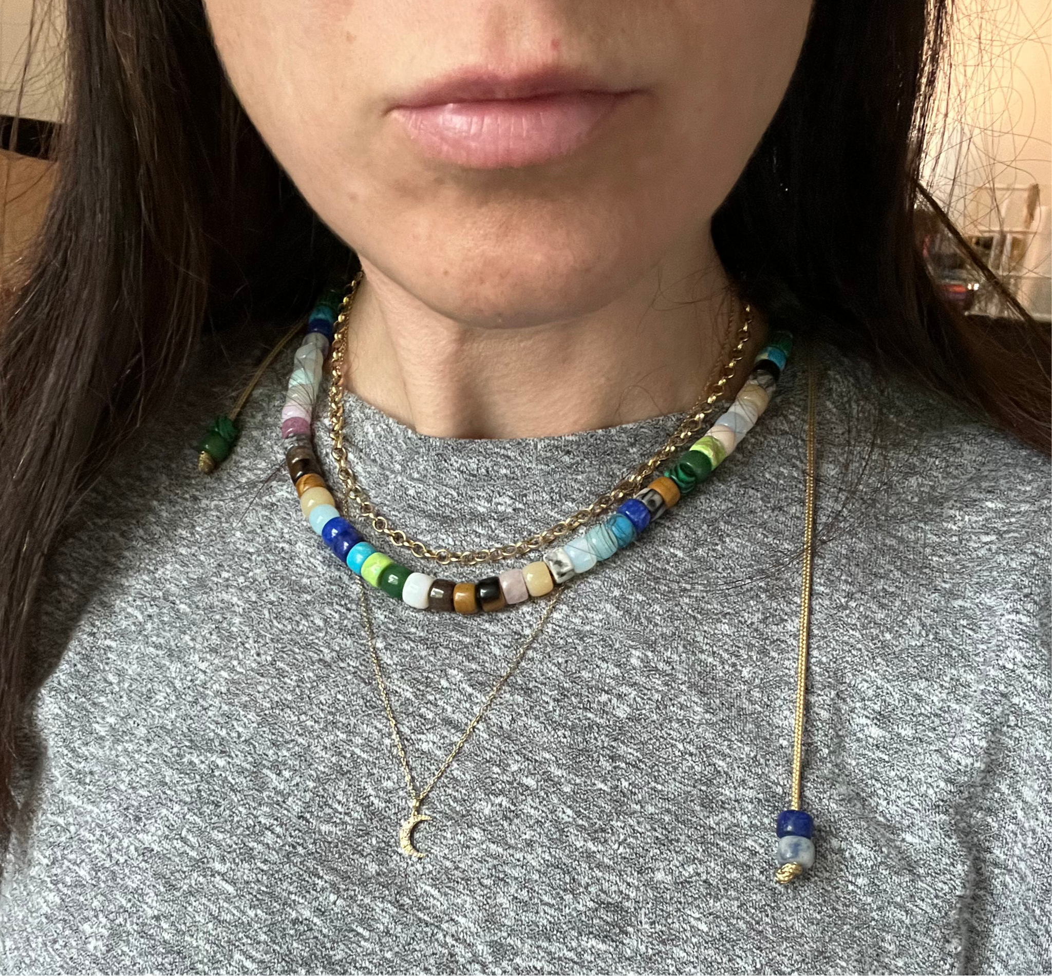 These bracelets and necklaces are a collection based around a rainbow of gemstone pony beads.