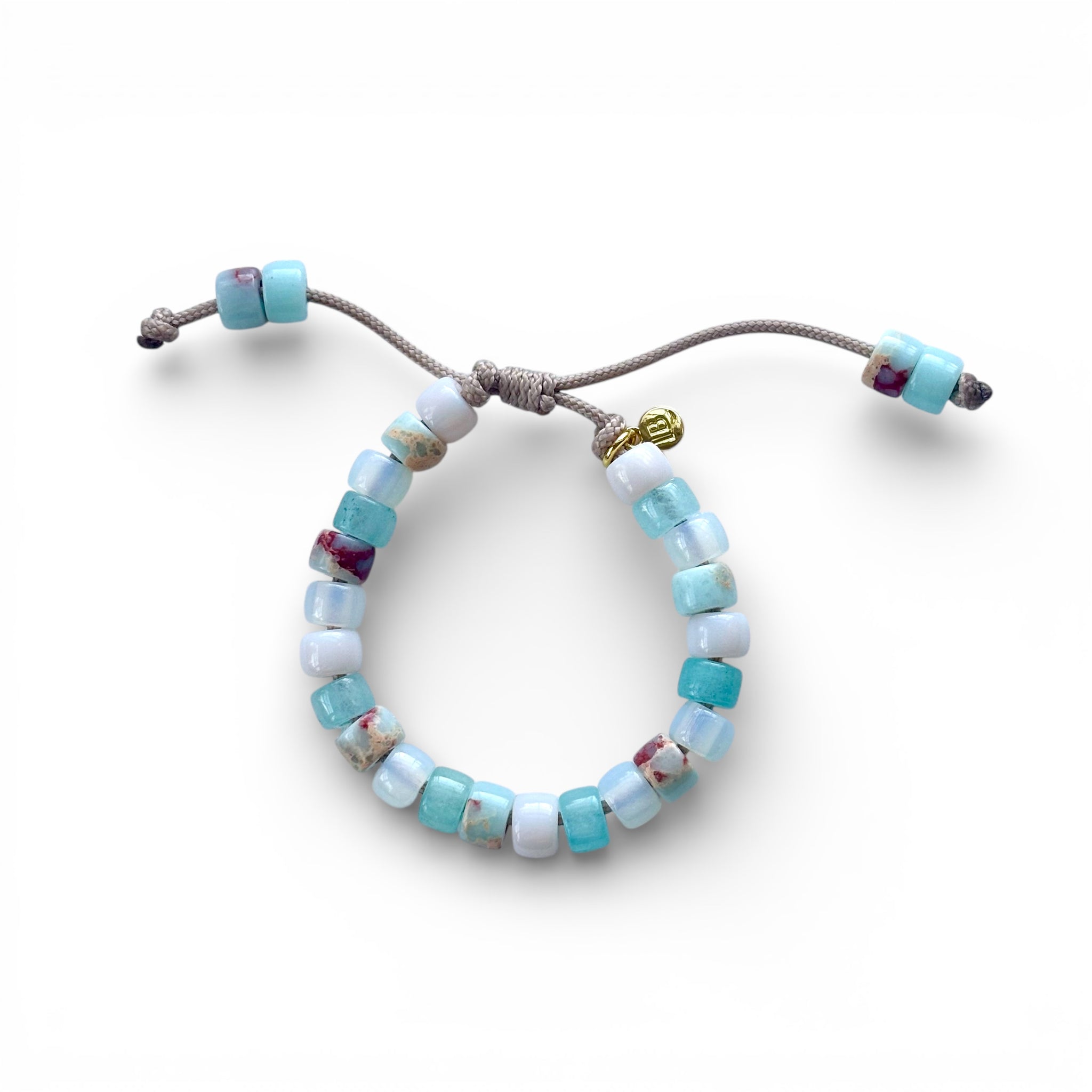 This collection features bracelets and necklaces made from a vibrant array of gemstone pony beads.