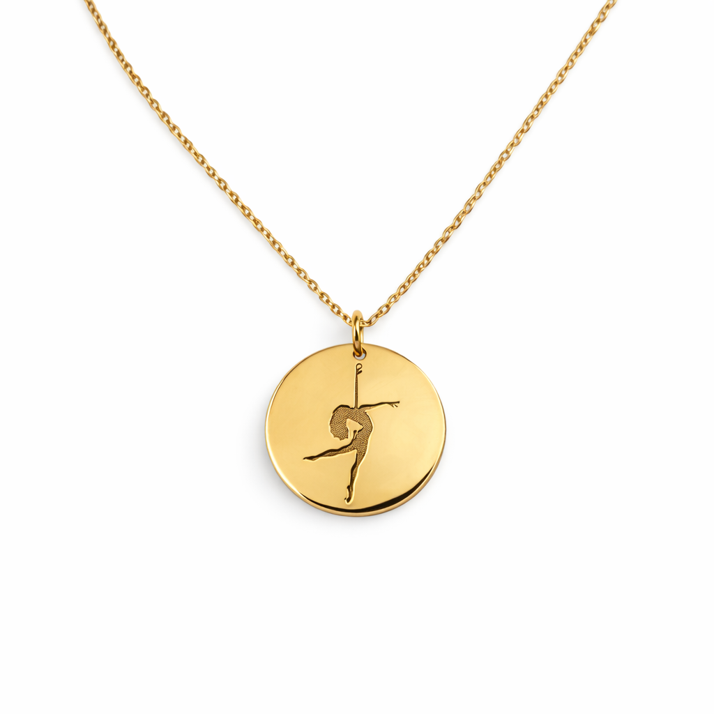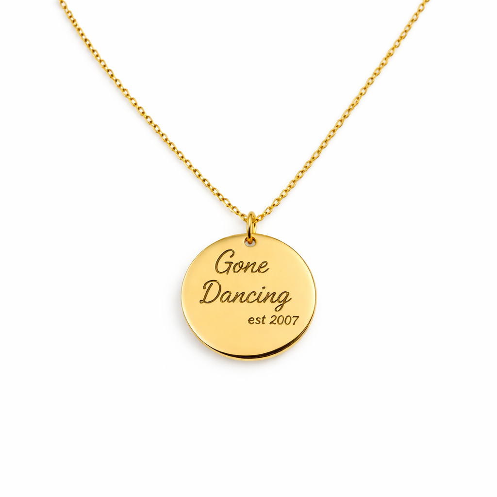 Each necklace features a medallion pendant with the Gone Dancing signature logo detailing on the front and the title logo engraved on the back. A timeless keepsake, this medallion is both a tribute to the beauty of dance and a versatile jewelry piece for everyday wear.