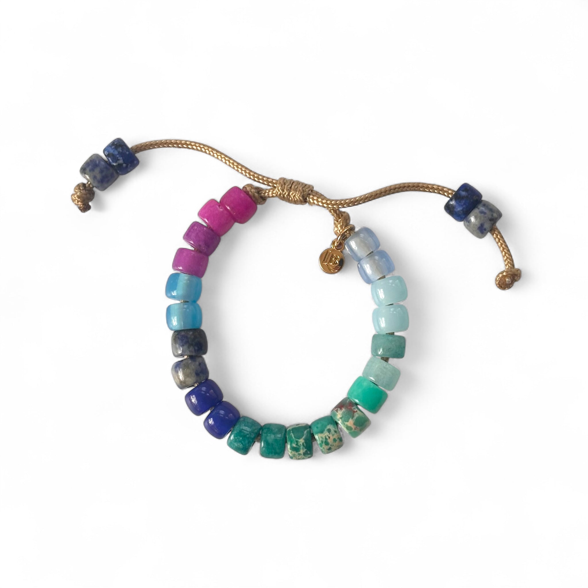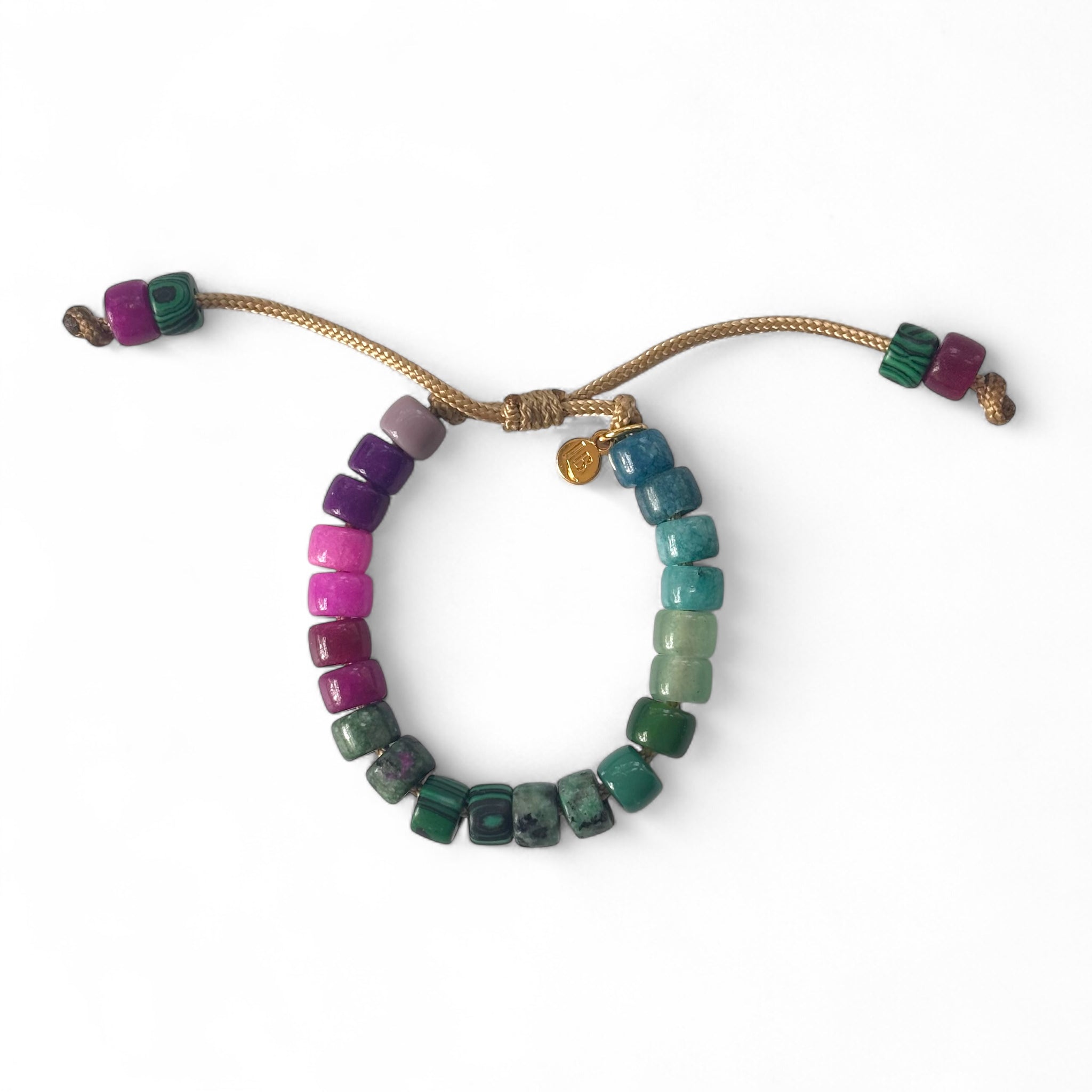 This collection features a vibrant array of natural gemstone pony beads in bracelets and necklaces.