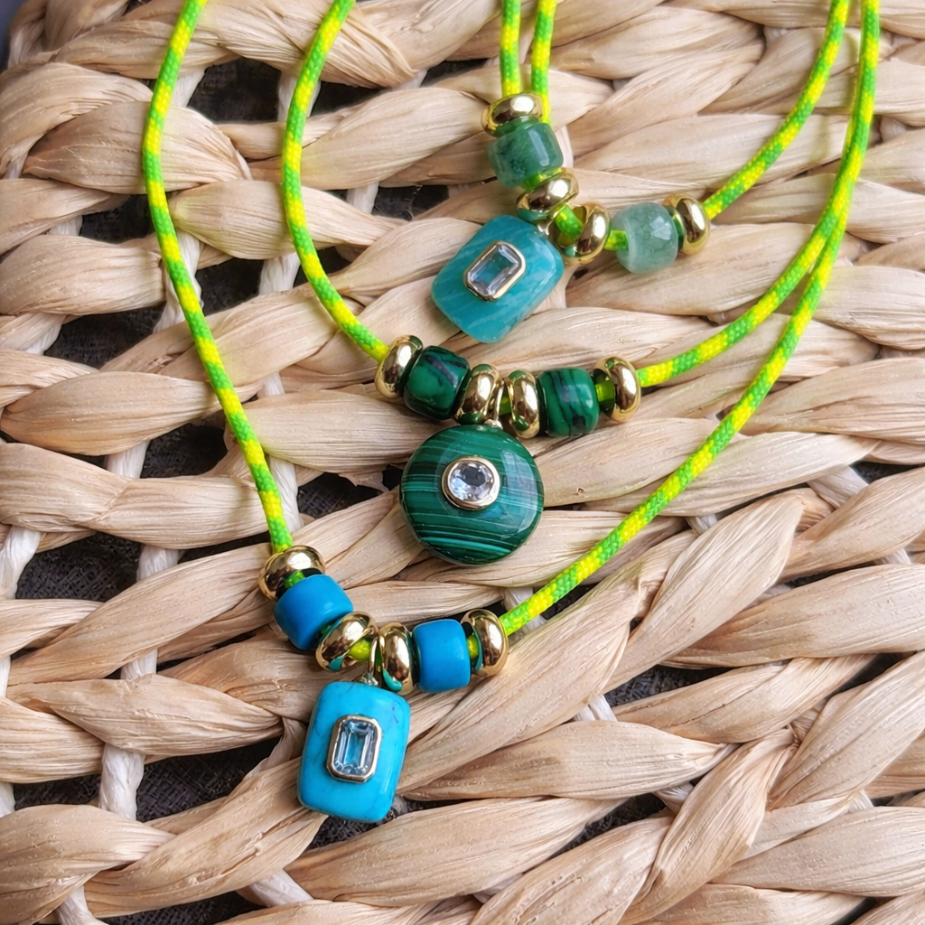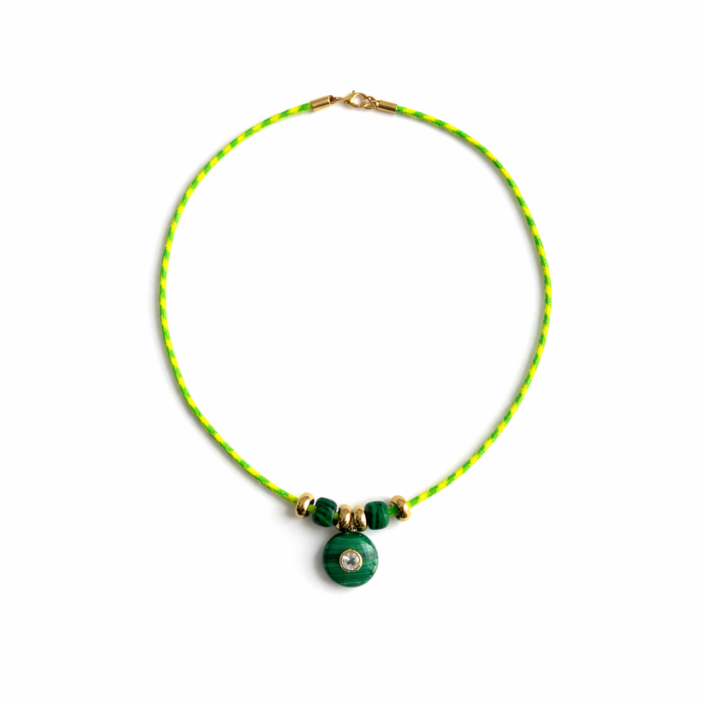 This neon cord necklace showcases a rich malachite round pendant set with a single crystal center. The deep green striations contrast beautifully against the high-voltage neon cord, while gold spacer beads add a polished finish.