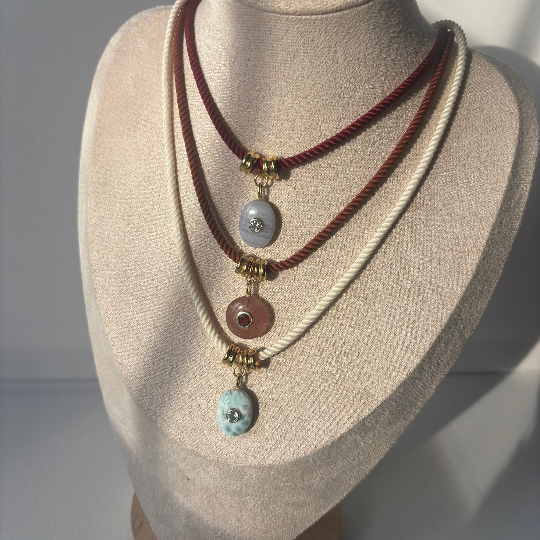 Part of the LB Beadz Rope Collection, these gemstone pendant necklaces are designed to feel effortless, wearable, and personal. Each piece features a smooth oval gemstone pendant accented with a subtle faceted stone, finished with gold filled accent beads and set on an adjustable rope cord.