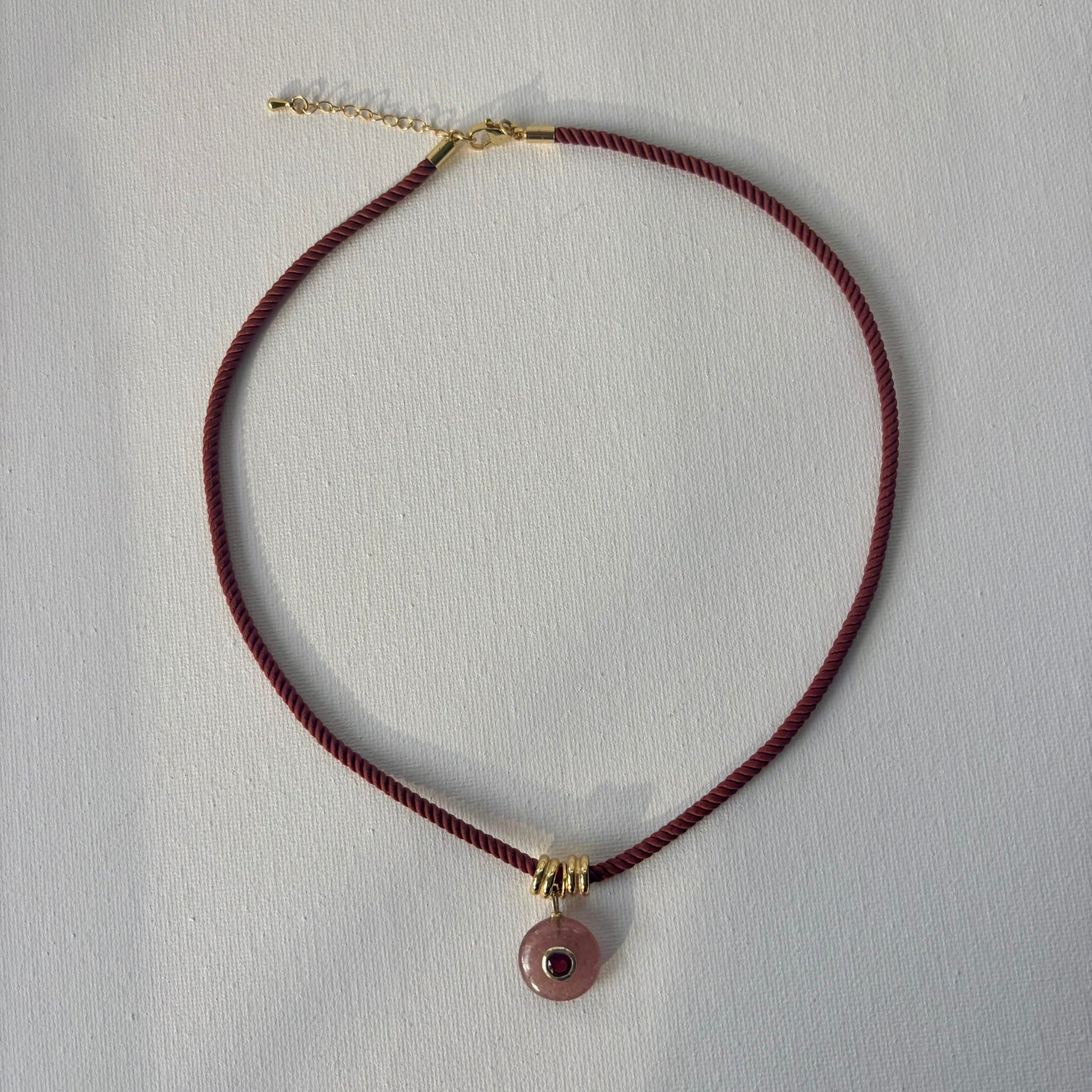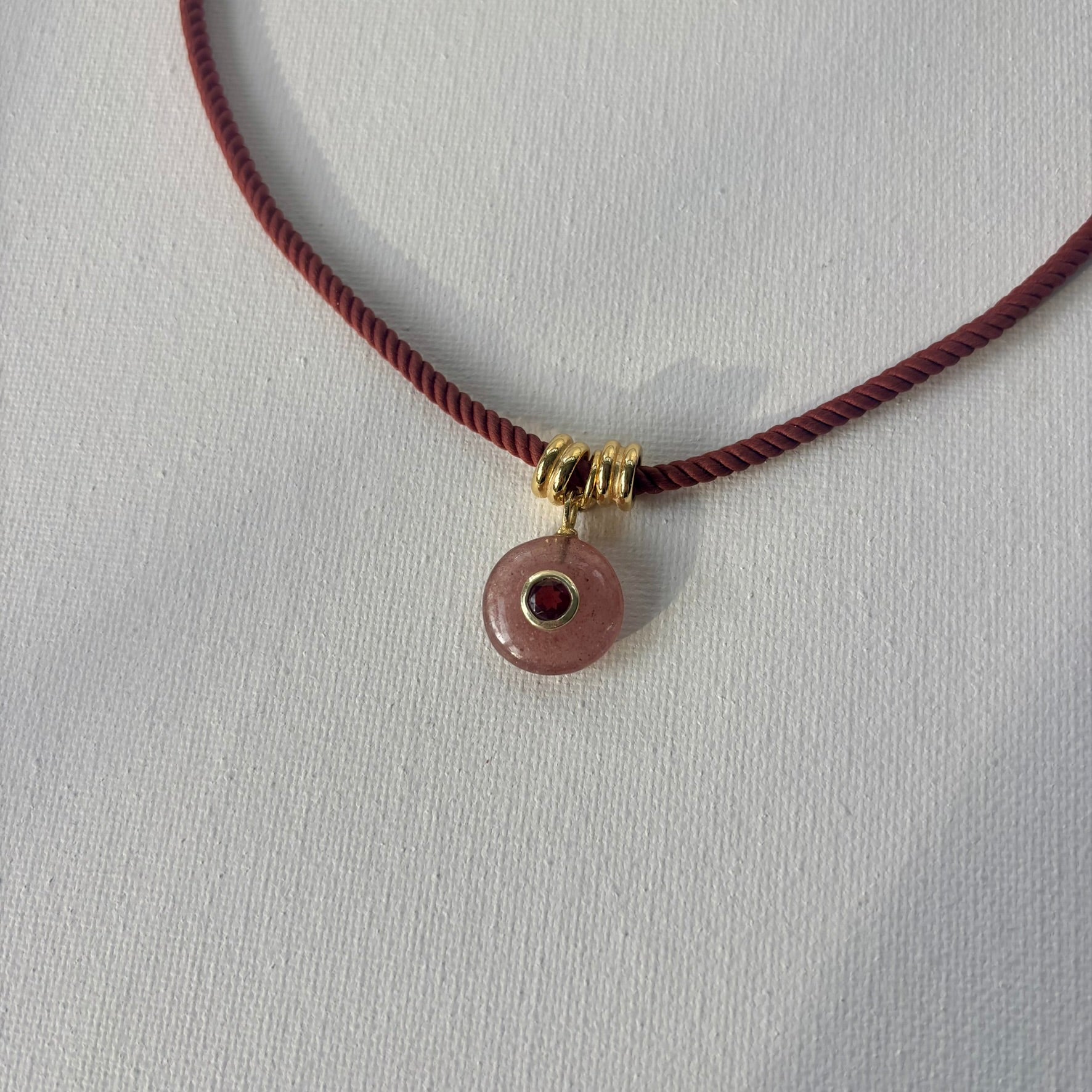 • Strawberry Quartz with Garnet on a maroon rope cord