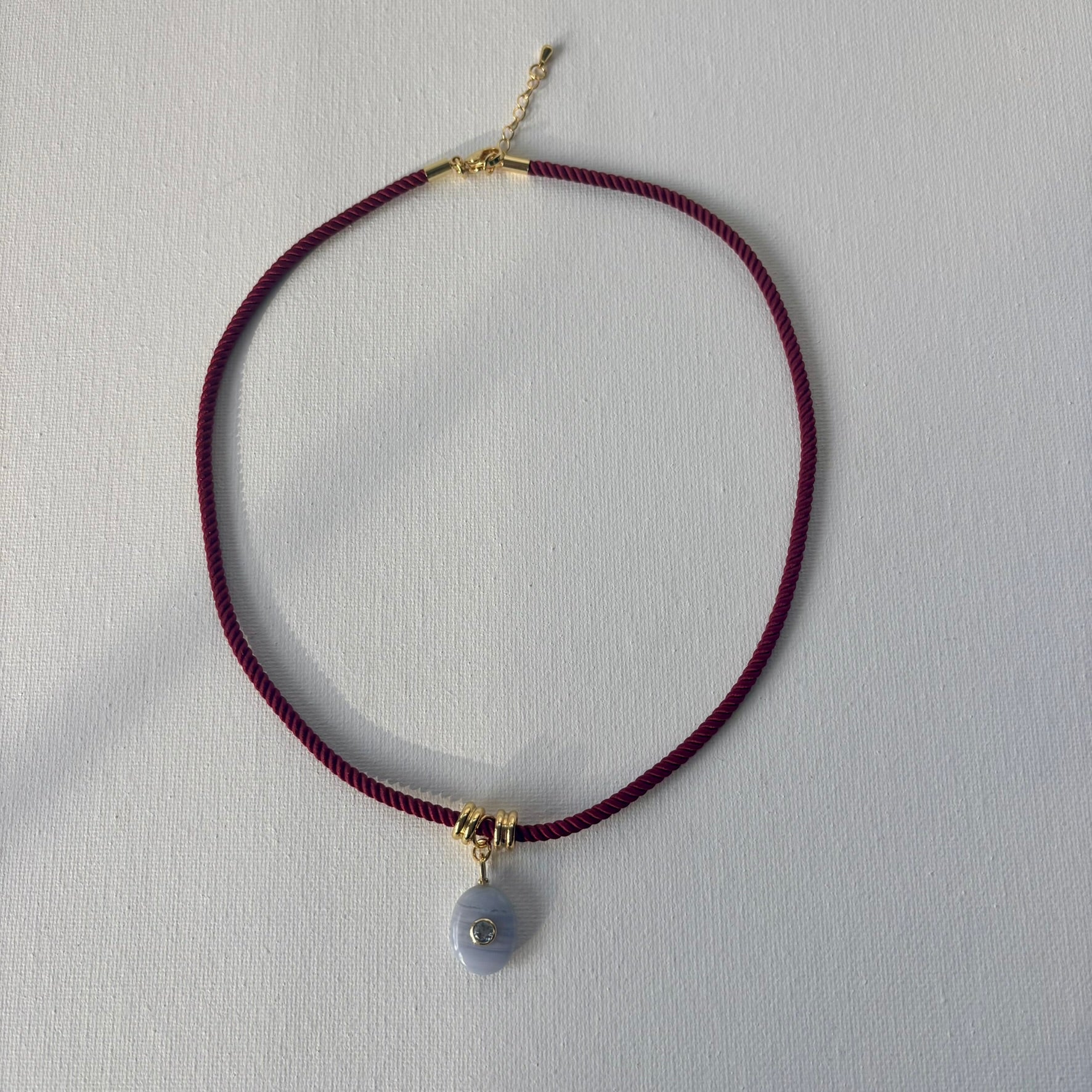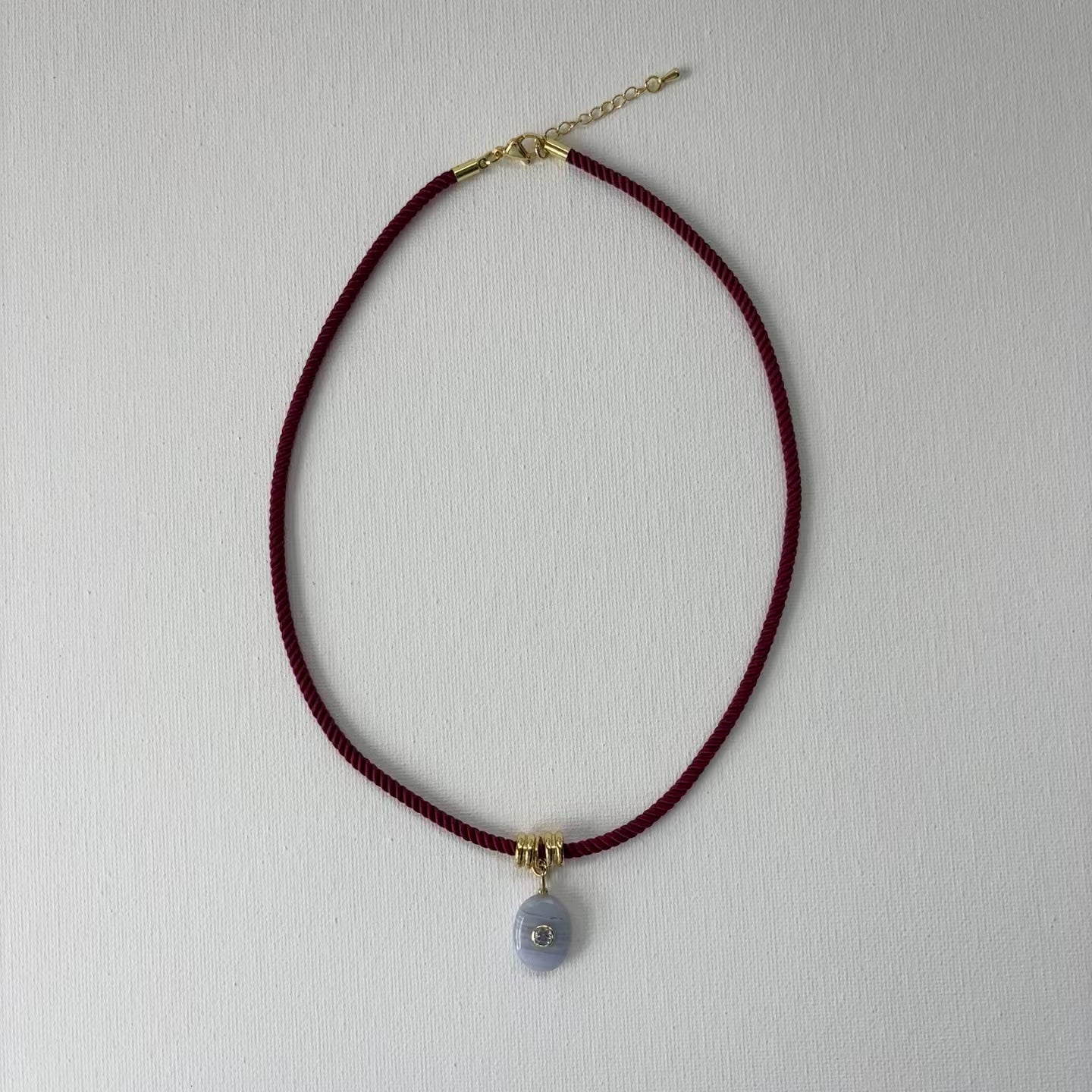 • Blue Lace Agate with Blue Topaz on a maroon rope cord