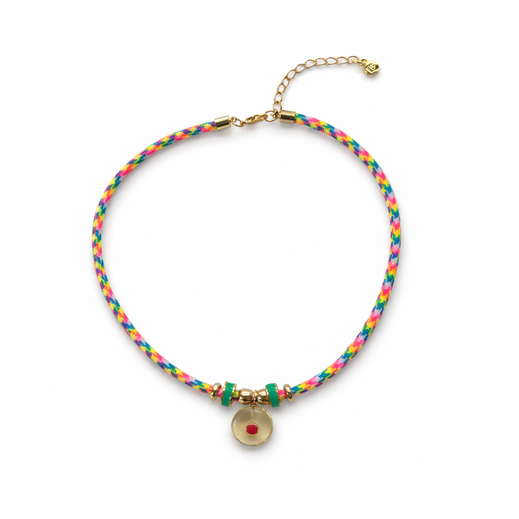 At 15 inches, it sits beautifully at the collarbone for a modern, elevated pop of color. Wear it alone as a statement or layered with fine gold chains for contrast.